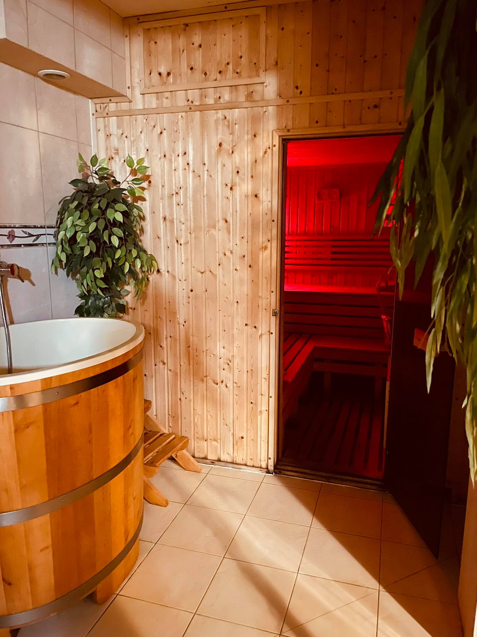 Zapraszamy do suchej sauny typu fińskiego. Obok sauny umieściliśmy przeręble. W niej możemy się ochłodzić po seansie, aby ponownie wejść do sauny.